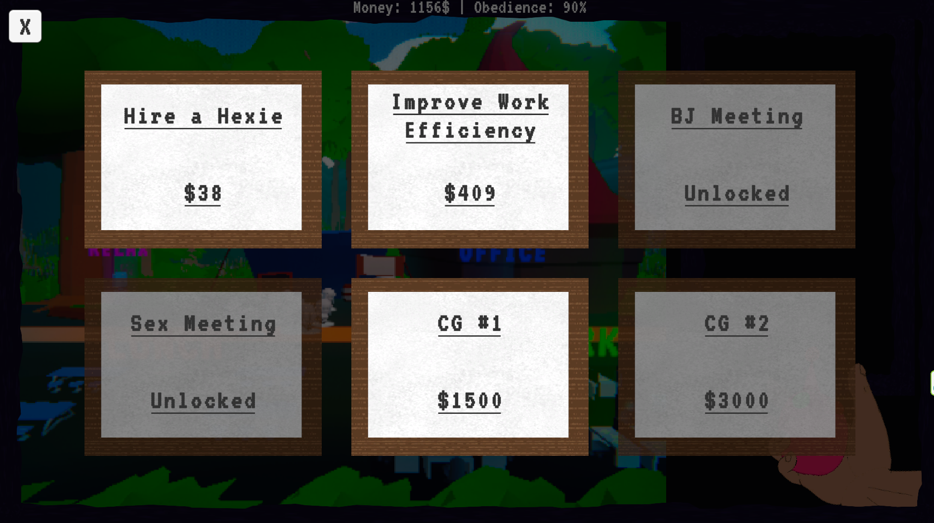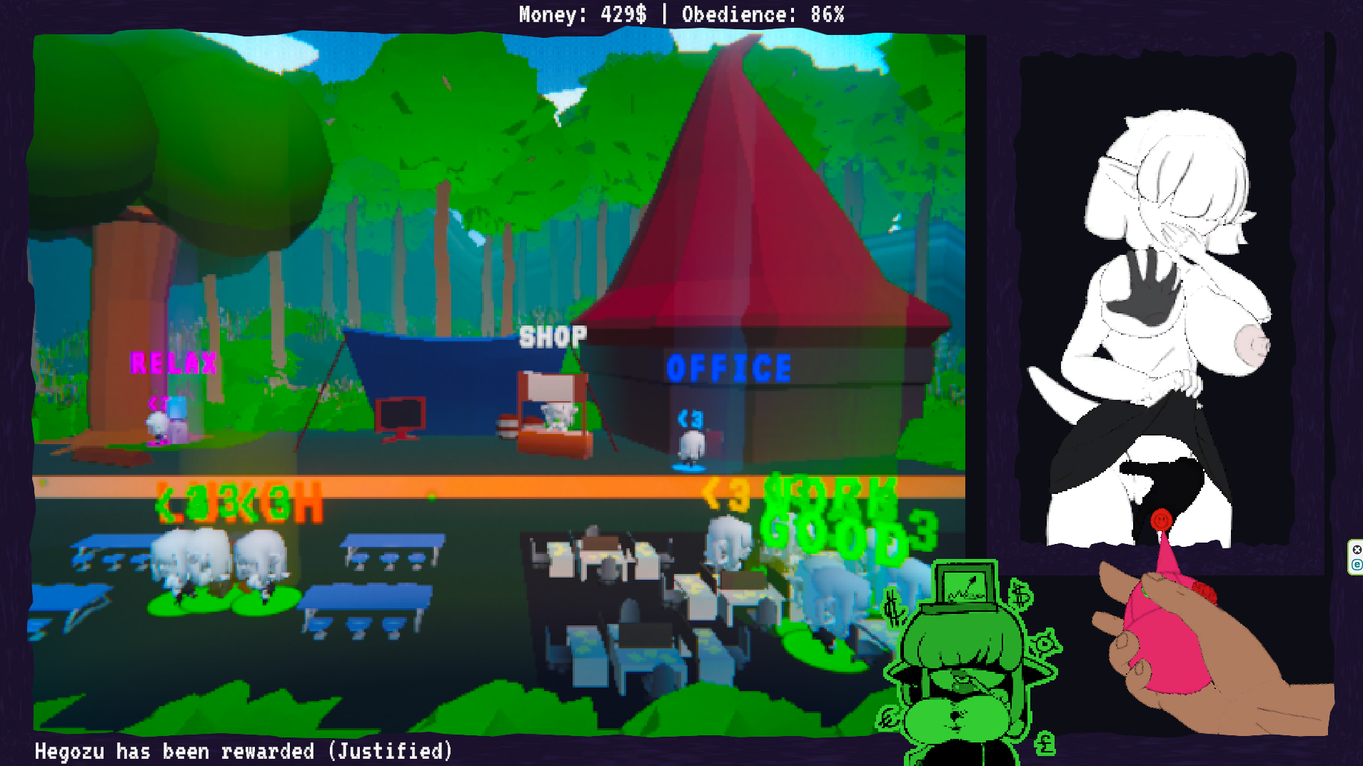 Cool game idea, and I absolutely LOVE the design of the Hexies. But there's a couple complaints I have: Firstly, the hitboxes of the Hexies are quite finicky, especially with the cursor being so large so it's hard to know where the actual "click" point is, especially when compounded with the fact that all the Hexies get in front of each other. Secondly, I can't tell what the purpose of the Relax and Lunch jobs are. Are they essentially just places for misbehaving Hexies to go, or do they have a purpose? If not, it feels like it'd be cool if they'd help you with increasing the obedience of your Hexies by giving them breaks.